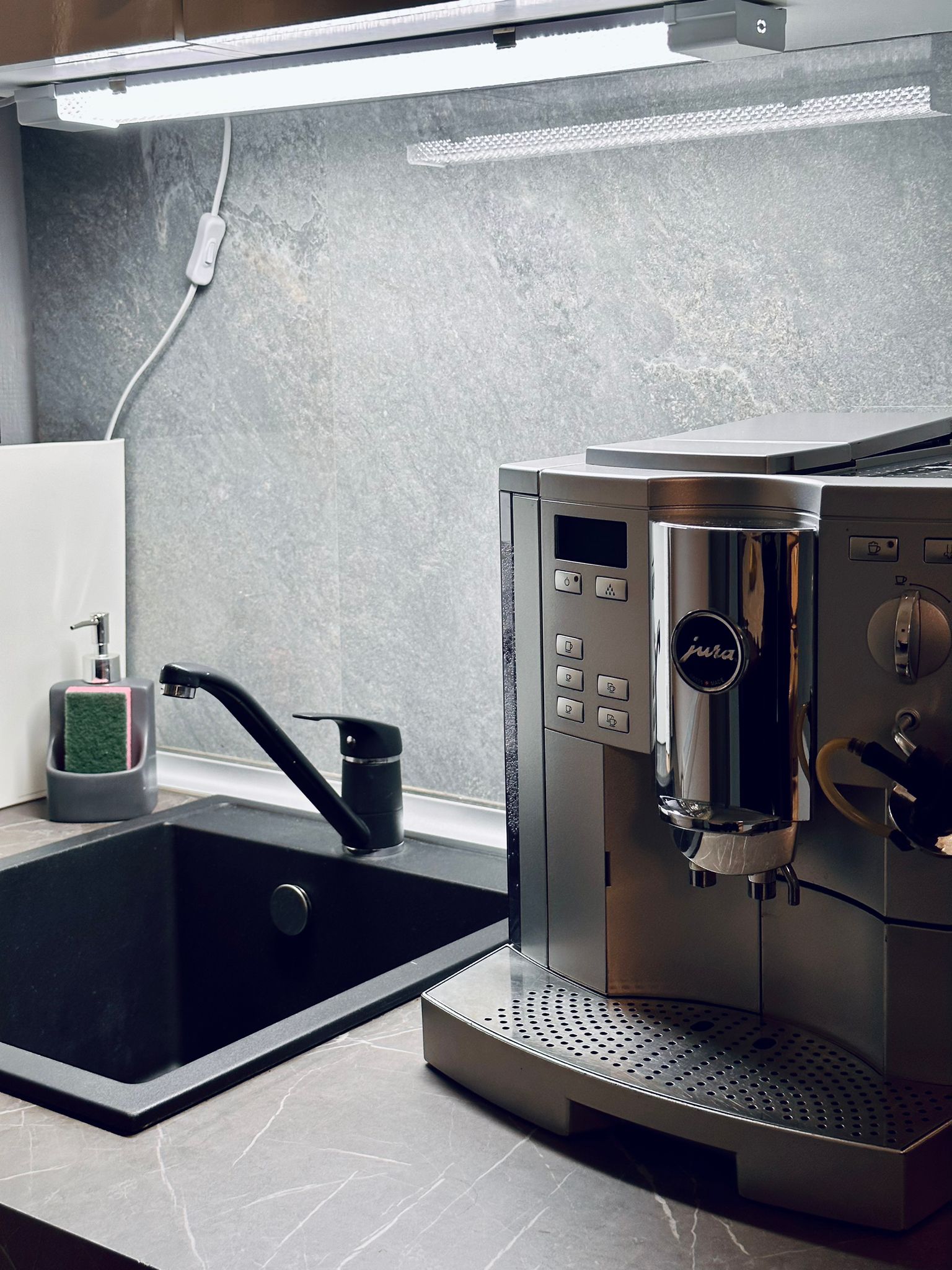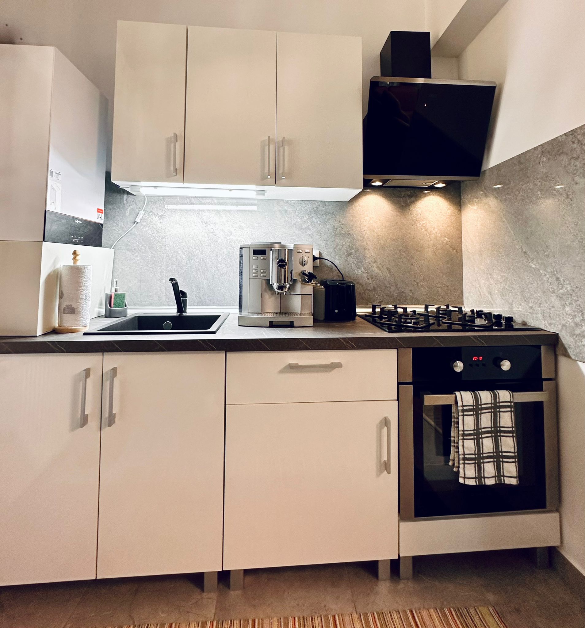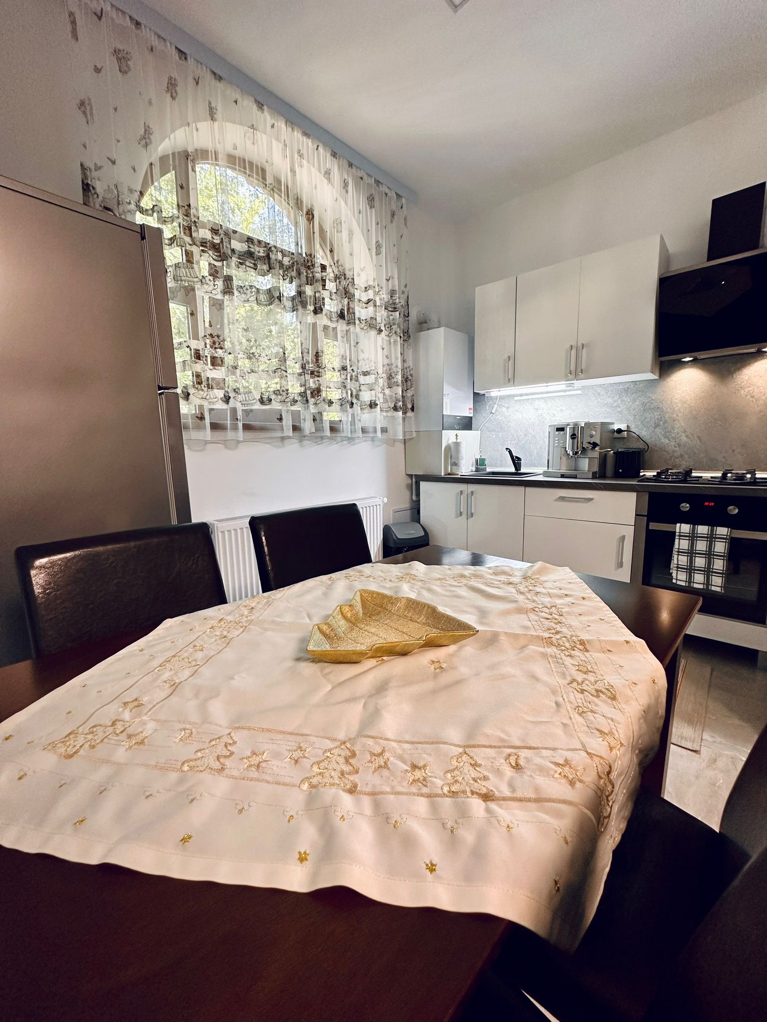 La etajul 1 este un apartament cu două camere, fiecare având balcon propriu, o bucătărie complet utilată cu loc de servit masa și o baie spațioasă dotată cu mașină de spalat rufe.