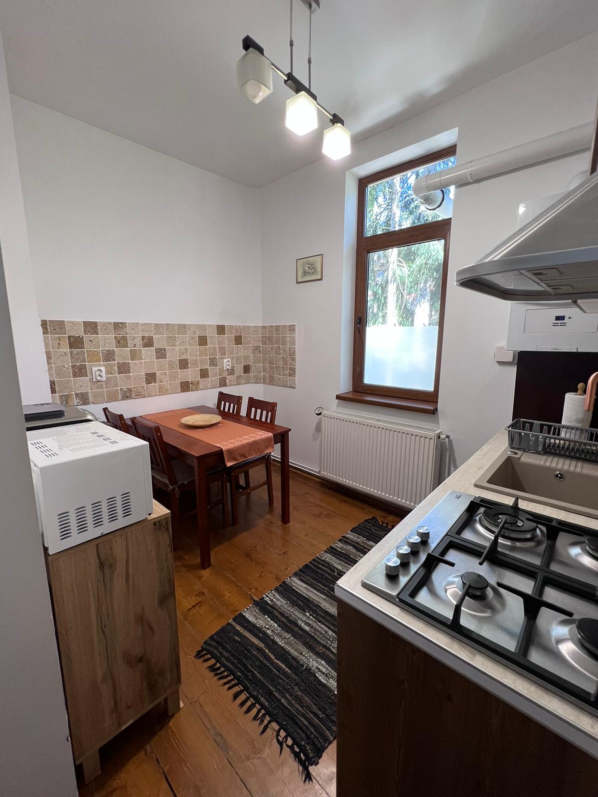 La etajul 1 este un apartament cu două camere, fiecare având balcon propriu, o bucătărie complet utilată cu loc de servit masa și o baie spațioasă dotată cu mașină de spalat rufe.